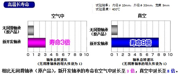 (1)400℃以下的高溫環(huán)境下,相對(duì)于無(wú)潤(rùn)滑軸承,壽命最長(zhǎng)延至其8倍。
