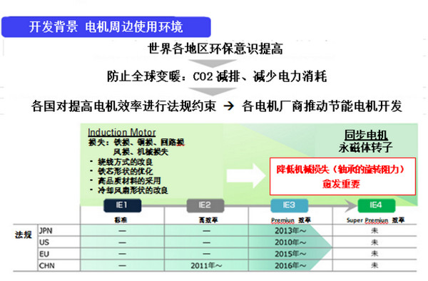 SIAIF推出可有效減少工業(yè)電機電力消耗的軸承占40%,目前該產品已開始銷售。 隨著世界范圍內環(huán)保意識的提高,所有產業(yè)均在推進二氧化碳的減排和電力的節(jié)能。尤其是給泵、送風機及壓縮機等機械提供驅動力的工業(yè)電機,其電力消耗占世界消耗總電量的40%以上。針對這些需求,各國均制定了旨在提高工業(yè)電機效能的相關法規(guī)。