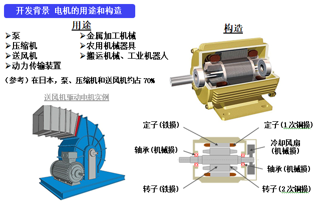 隨著世界范圍內(nèi)環(huán)保意識的提高,所有產(chǎn)業(yè)均在推進(jìn)二氧化碳的減排和電力的節(jié)能。尤其是給泵、送風(fēng)機及壓縮機等機械提供驅(qū)動力的工業(yè)電機,其電力消耗占世界消耗總電量的40%以上。針對這些需求,世界各國均制定了旨在提高工業(yè)電機效能的相關(guān)法規(guī)。